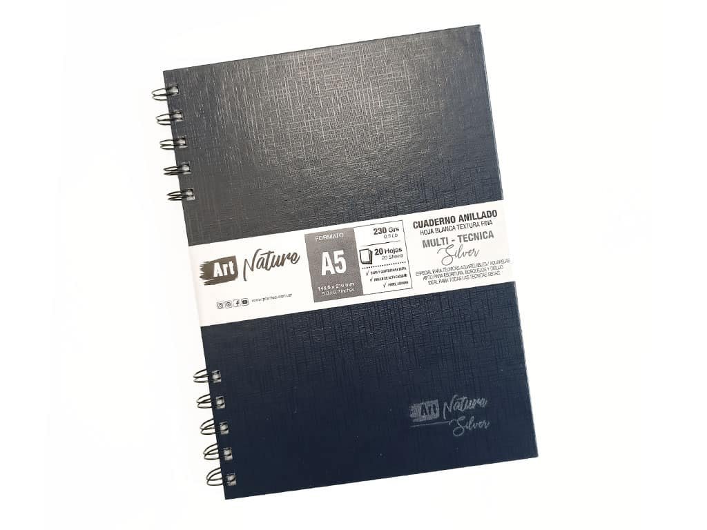 Excelente cuaderno anillado texturado Art Nature libre de ácidos y cloro para artistas. Textura grano fino – hojas de 230 grs. Resistente al envejecimiento. No contiene blanqueadores ópticos. Admite técnicas secas y húmedas.