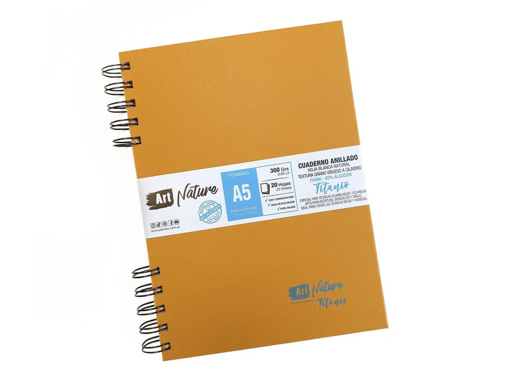 Excelente cuaderno anillado texturado Art Nature libre de ácidos y cloro para artistas. Textura grano fino – hojas de 300 grs. – 60% algodón. Resistente al envejecimiento. No contiene blanqueadores ópticos. Admite técnicas secas y húmedas.