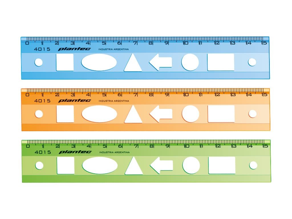 Regla con figuras geométricas integradas, ideal para uso escolar y aprendizaje de formas.
